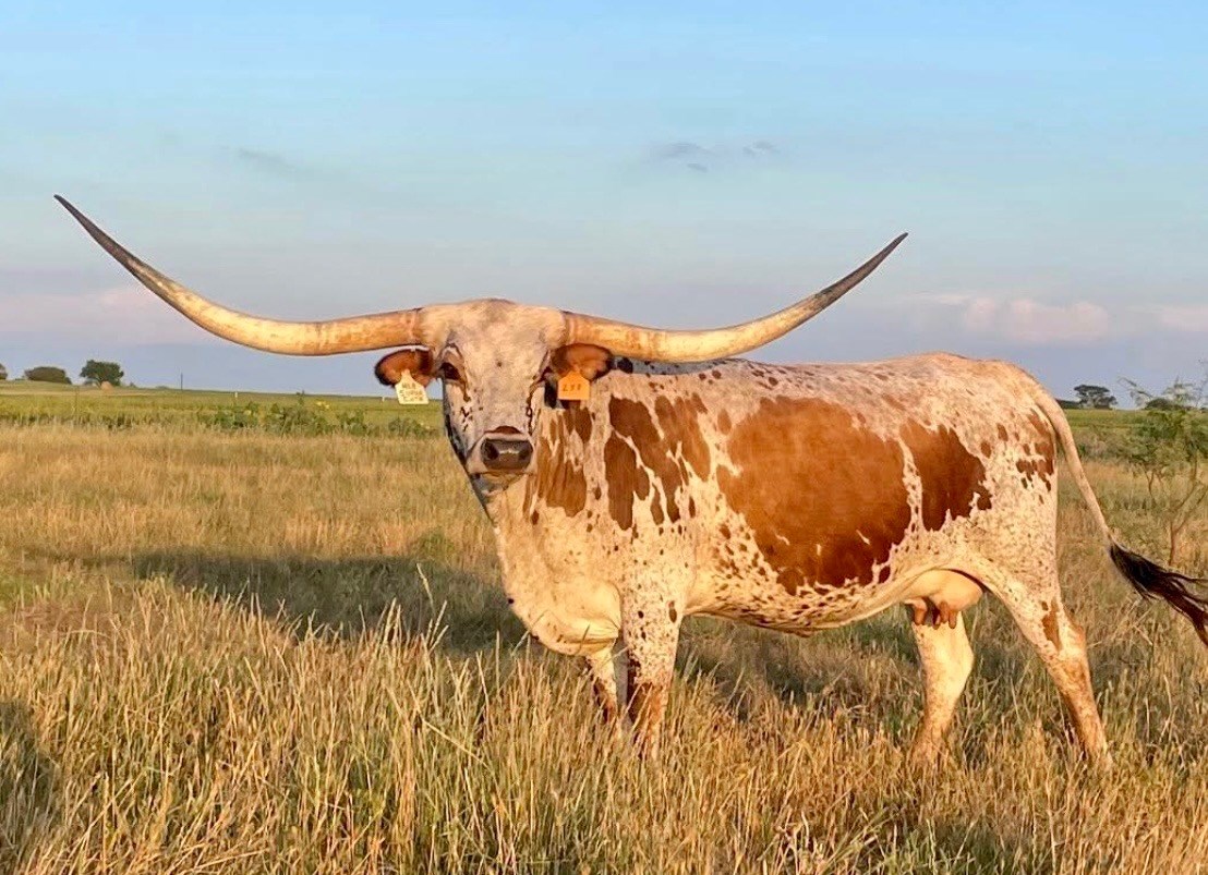 This young cow will stay with us and it's hard to put in words what she means to us. Let's just start with that expensive line of females on top of her pedigree of Hubbells Field of Dreams with Top Caliber up there and Love the bottom side as well. Out in the field her seasonal changing striking leather hide along with her impeccable build will make you grab your camera every time. She acts like a bull every time when another cow comes into heat and that's going to a very valuable tool to us in the future on us AI'ing our cows in their natural heat. Her horns are majestic especially against the skyline with her frame. Very good disposition and great mother that threw us a nice correct heifer out Elevation in 2024. Her bull calf out of Goose in 2025 is built like an absolute tank and very correct as well. People talk about foundation cows...well it doesn't get much better than her and we're very blessed to have her here on this farm.
